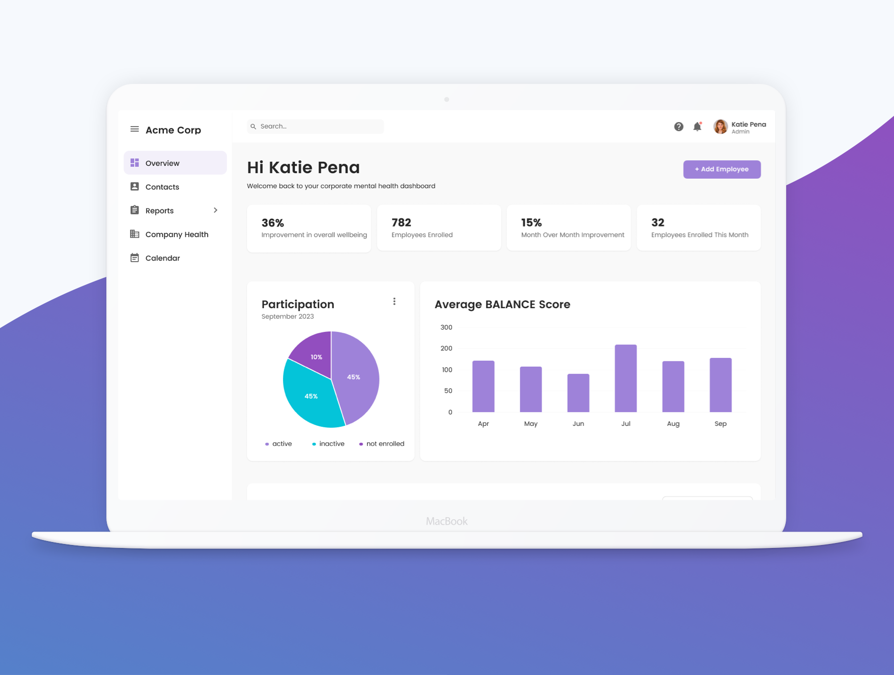In addition to the mobile app, a corporate reporting dashboard was designed for company admins and executives to onboard employees into the system and monitor the stress and burnout scores of their company as a whole and at departmental levels viewing aggregated anonymized data.
