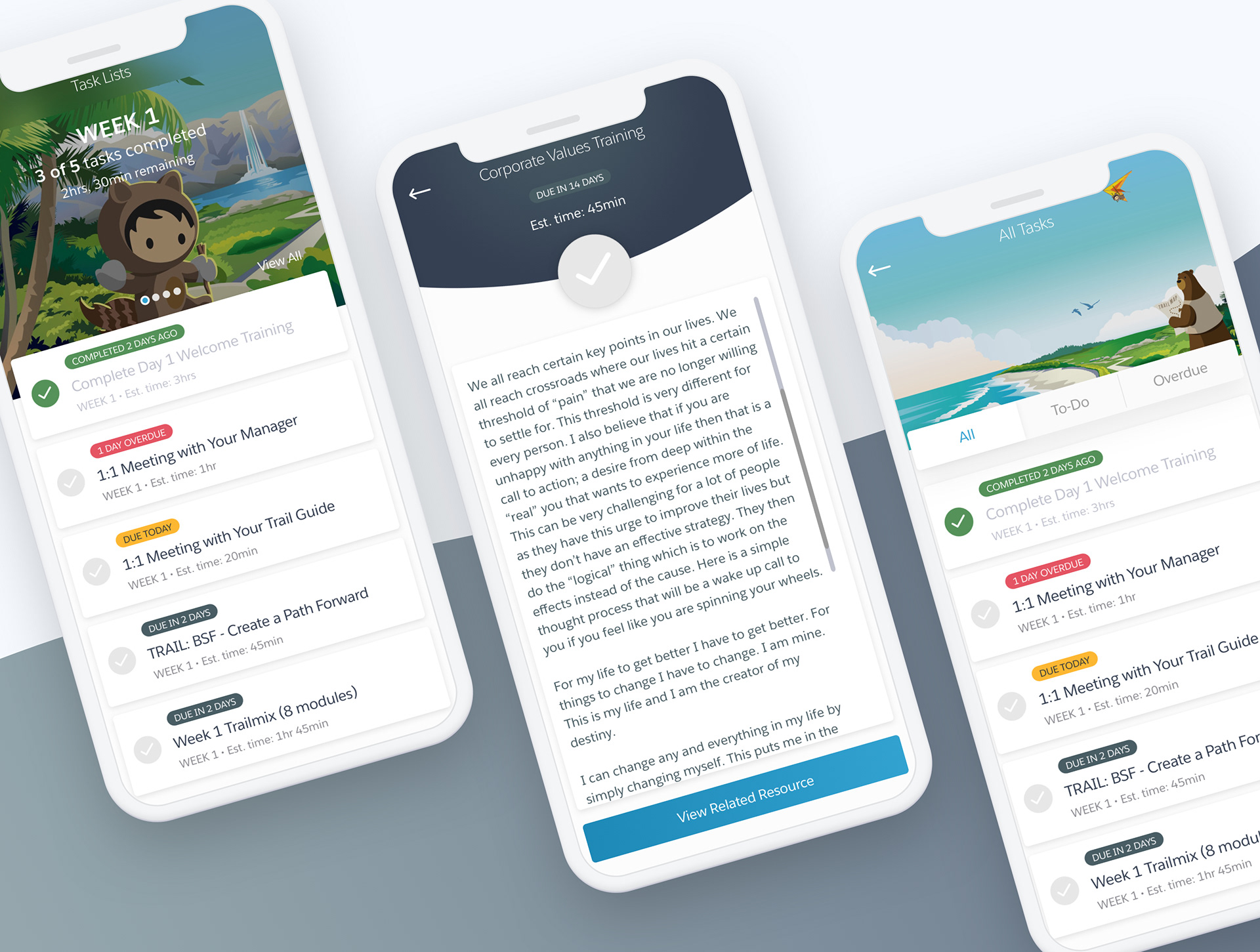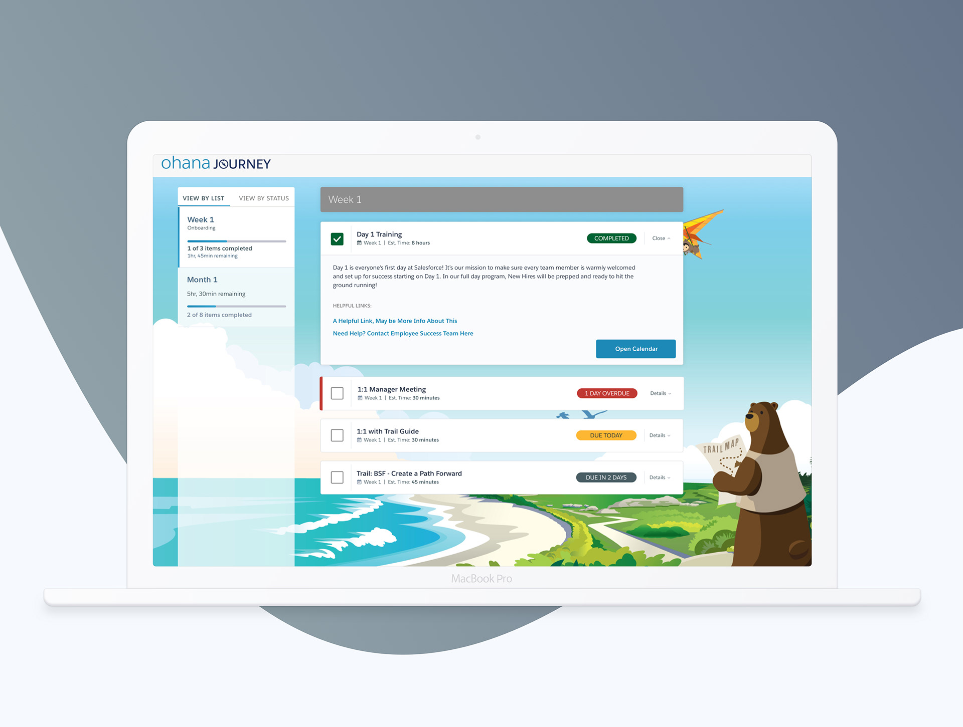 Ohana Journey is an application designed to ease new-hires through their first few months as employees at Salesforce with a simple checklist of critical tasks, training, and meetings. All tasks are broken down by timeline so employees know what they need to do, when they need to do it, and have links to relevant resources. It was created for both web and mobile use, and includes a view for managers to track their new-hires’ progress.